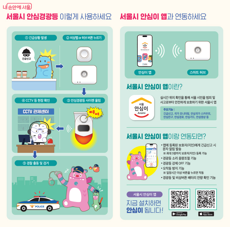 이 ‘안심경광등’은 비상벨이 포함된 경보 시스템으로, 긴급상황 발생 시 버튼을 누르면 점멸등과 사이렌이 작동합니다. 동시에 관할 자치구의 관제센터에 자동 신고가 접수되며, 경찰 출동 요청까지 연계됩니다. 또한 서울시의 ‘안심이앱’을 통해 사전에 등록된 보호자 최대 5명에게 긴급 알림 메시지가 발송되어, 즉각적인 도움을 요청할 수 있는 시스템이 갖춰져 있습니다.